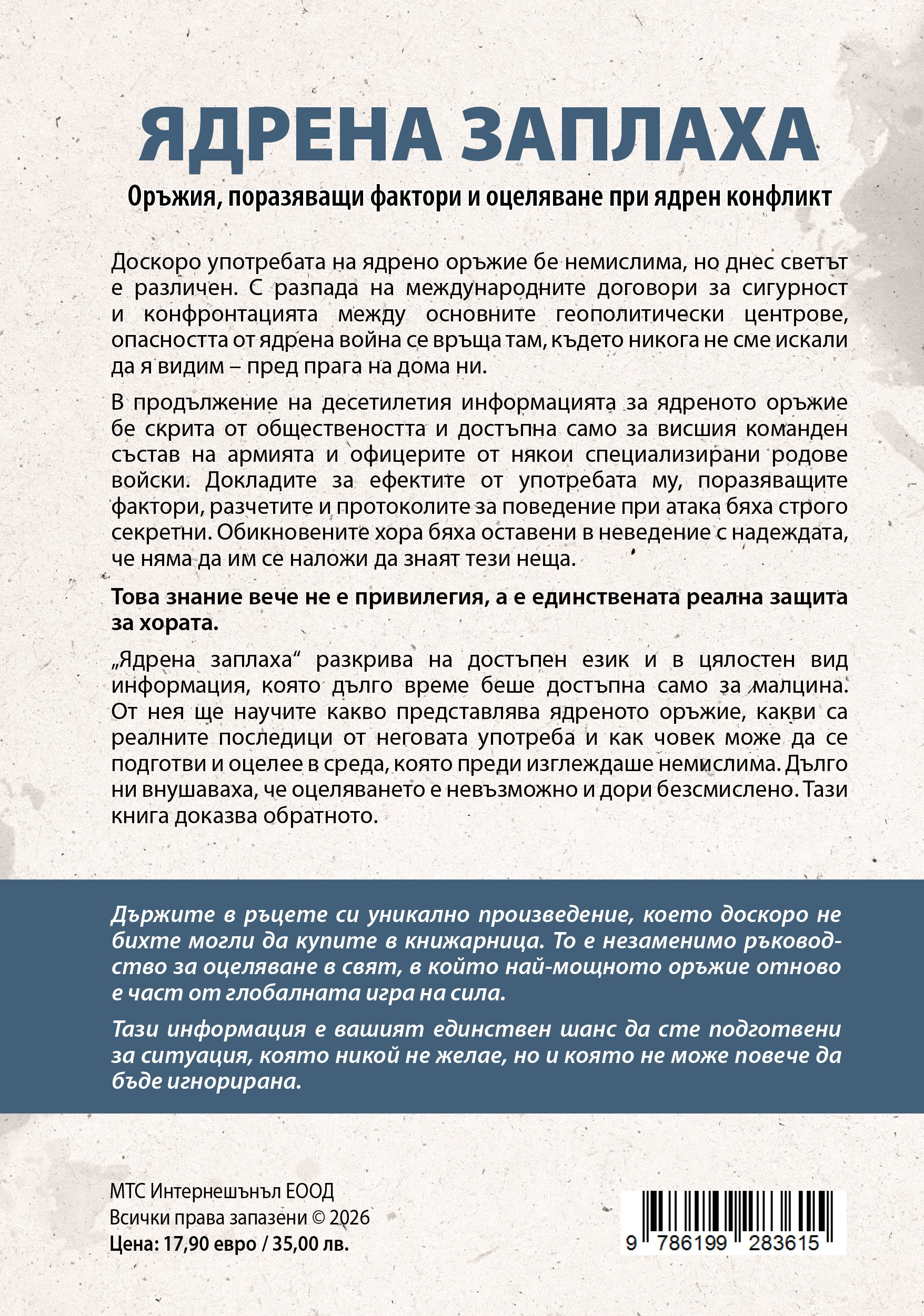 „Ядрена заплаха“ разкрива на достъпен език информация, която дълго време беше достъпна само за избрани военни. Ще научите какво представлява ядреното оръжие, какви са реалните последици от неговата употреба и как човек може да се подготви и оцелее в среда, която преди изглеждаше немислима. Дълго ни внушаваха, че оцеляването е невъзможно и дори безсмислено. Тази книга доказва обратното.
